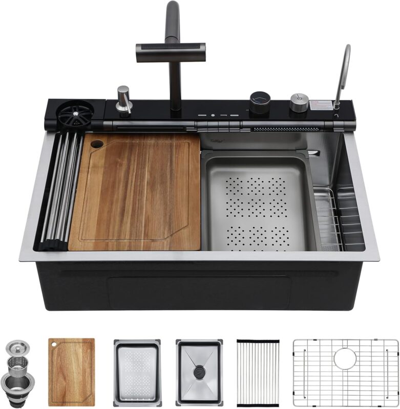 30 Inch Drop In Waterfall Kitchen Sink – Digital Multifunctional Workstation Topmount Smart Kitchen Sink 16 Gauge Stainless Steel Single Bowl Over Counter Sinks #TLWF-0007